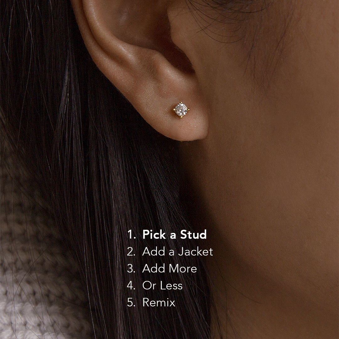 Our collection is custom designed by us. We obsess over proportions and details so all earring studs and jackets fit together perfectly. It means you can mix, match, and layer with effortless creativity.