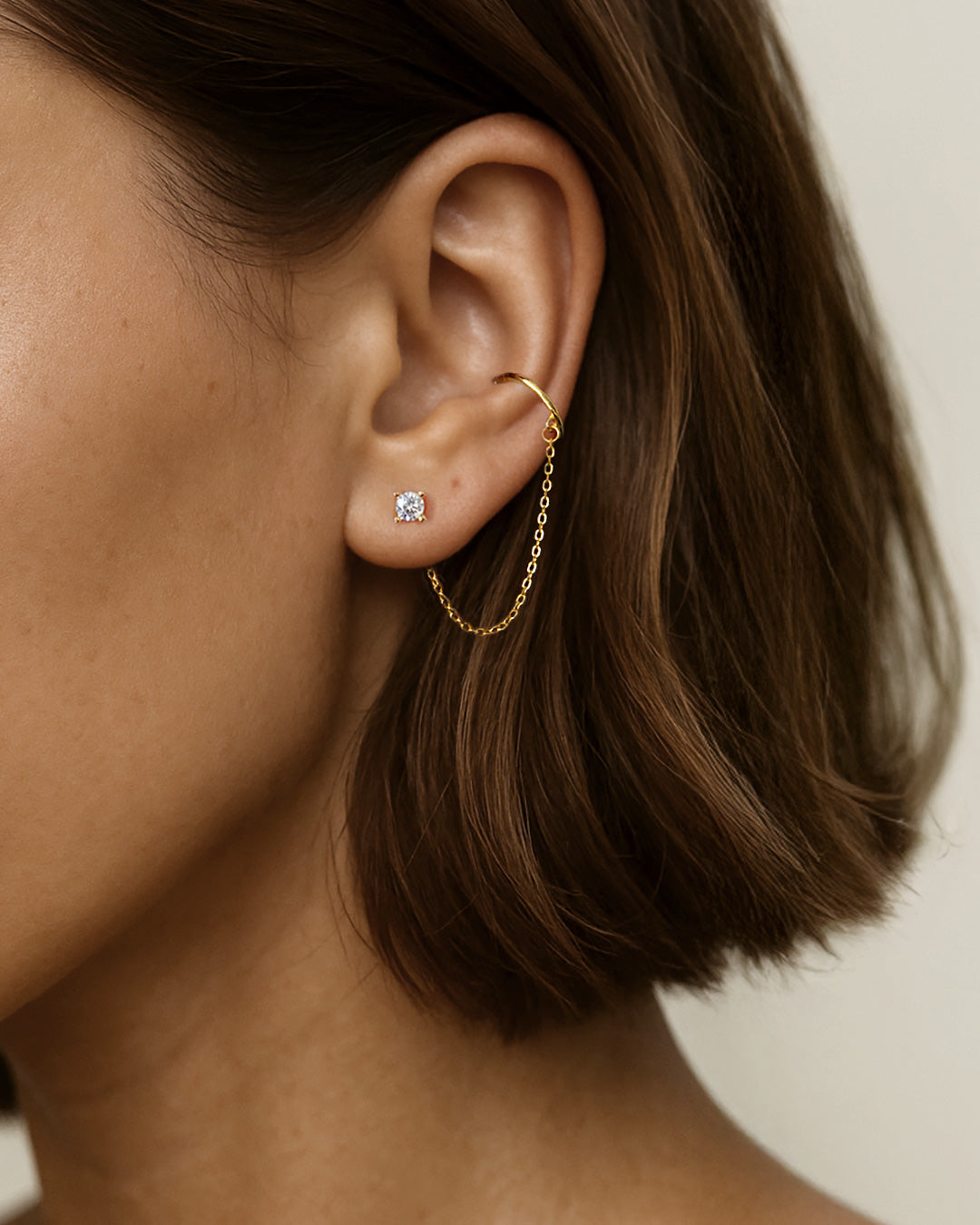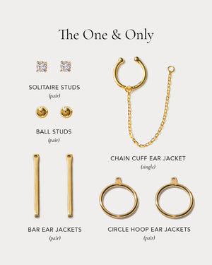 One piercing, all the fun. The One & Only set gives you the stacked earring look with no extra piercings needed. You just need one piercing. It starts with our Chain Cuff Ear Jacket that cuffs onto your ear to create the illusion of a stacked look. It’s perfectly paired with our most-loved and versatile studs and ear jackets, to unlock endless creativity and effortless combinations. This set includes: